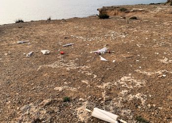 Colillas, cristales rotos y latas por el suelo tras una celebración en la costa de la bahía de Cala Xarraca