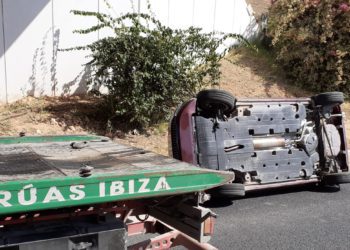 Un coche de rent a car ha volcado hoy tras golpear la rueda delantera derecha con un bordillo. Los tres ...