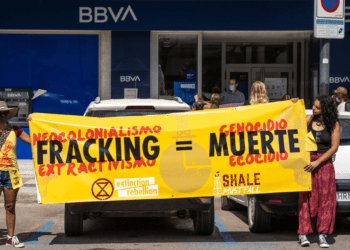 Extinction Rebellion (XR) Ibiza se ha concentrado esta mañana en la sucursal del banco BBVA de la calle Enrique Fajarnés ...
