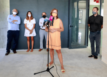 La alcaldesa de Santa Eulària, Carmen Ferrer, y los concejales de Deportes y de la Parròquia de Jesús, Toni Ramón ...