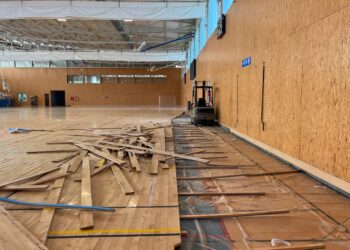 Comienza la retirada del parquet del pabellón de Can Guerxo, afectado por la DANA